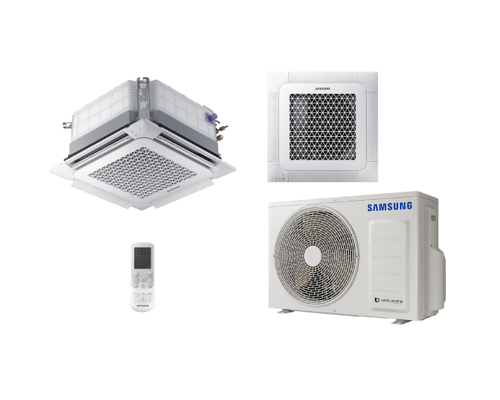Em vez de conectar apenas uma unidade interna, o ar-condicionado de teto Samsung pode conectar até 4 unidades a uma única unidade externa. Com um único controle remoto, o usuário pode operar todos os tipos de unidades internas simultaneamente.